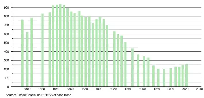 L'évolution du nombre d'habitants est connue à travers les recensements de la population effectués dans la commune depuis 1793. Pour les communes de moins de 10 000 habitants, une enquête de recensement portant sur toute la population est réalisée tous les cinq ans, les populations de référence des années intermédiaires étant quant à elles estimées par interpolation ou extrapolation[23]. Pour la commune, le premier recensement exhaustif entrant dans le cadre du nouveau dispositif a été réalisé en 2006[24].