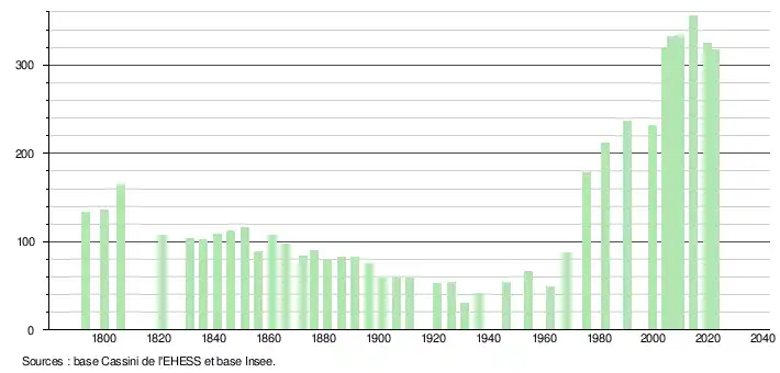 L'évolution du nombre d'habitants est connue à travers les recensements de la population effectués dans la commune depuis 1793. Pour les communes de moins de 10 000 habitants, une enquête de recensement portant sur toute la population est réalisée tous les cinq ans, les populations de référence des années intermédiaires étant quant à elles estimées par interpolation ou extrapolation[18]. Pour la commune, le premier recensement exhaustif entrant dans le cadre du nouveau dispositif a été réalisé en 2004[19].
