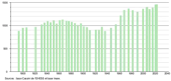 L'évolution du nombre d'habitants est connue à travers les recensements de la population effectués dans la commune depuis 1793. Pour les communes de moins de 10 000 habitants, une enquête de recensement portant sur toute la population est réalisée tous les cinq ans, les populations de référence des années intermédiaires étant quant à elles estimées par interpolation ou extrapolation[13]. Pour la commune, le premier recensement exhaustif entrant dans le cadre du nouveau dispositif a été réalisé en 2005[14].