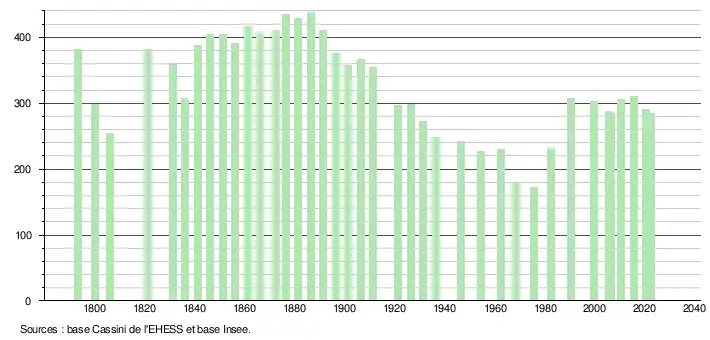 L'évolution du nombre d'habitants est connue à travers les recensements de la population effectués dans la commune depuis 1793. Pour les communes de moins de 10 000 habitants, une enquête de recensement portant sur toute la population est réalisée tous les cinq ans, les populations de référence des années intermédiaires étant quant à elles estimées par interpolation ou extrapolation[20]. Pour la commune, le premier recensement exhaustif entrant dans le cadre du nouveau dispositif a été réalisé en 2005[21].