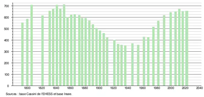 L'évolution du nombre d'habitants est connue à travers les recensements de la population effectués dans la commune depuis 1793. Pour les communes de moins de 10 000 habitants, une enquête de recensement portant sur toute la population est réalisée tous les cinq ans, les populations de référence des années intermédiaires étant quant à elles estimées par interpolation ou extrapolation[16]. Pour la commune, le premier recensement exhaustif entrant dans le cadre du nouveau dispositif a été réalisé en 2006[17].