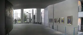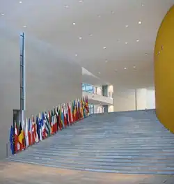 - au premier étage : la salle de conférences internationale d'une capacité de trente-deux places, équipée de cabines d'interprétation et de deux cents autres places réservées à la presse