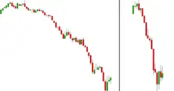 - un trait fin vertical joint le cours le plus bas avec la base du rectangle (niveau de la clôture pour une bougie baissière, l'ouverture pour une haussière)