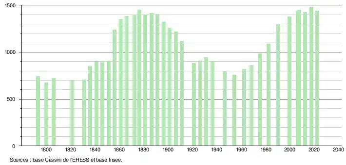 L'évolution du nombre d'habitants est connue à travers les recensements de la population effectués dans la commune depuis 1793. Pour les communes de moins de 10 000 habitants, une enquête de recensement portant sur toute la population est réalisée tous les cinq ans, les populations de référence des années intermédiaires étant quant à elles estimées par interpolation ou extrapolation[17]. Pour la commune, le premier recensement exhaustif entrant dans le cadre du nouveau dispositif a été réalisé en 2007[18].