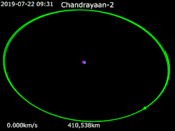 Compte tenu de la masse de Chandrayaan-2, le lanceur GSLV-Mk III, n'a pas la capacité d'injecter la sonde spatiale directement sur une trajectoire l'amenant à proximité de la Lune. Chandrayaan-2 est d'abord placée sur une orbite terrestre elliptique de 170 × 18 500 kilomètres. Cette orbite est ensuite progressivement relevée en utilisant à plusieurs reprises les moteurs-fusées de la sonde spatiale. L'orbite est ainsi modifiée à cinq reprises les 24, 26, , 2 et et portée finalement à 276 × 142 975 km. Une dernière manœuvre, effectuée le , place la sonde spatiale sur une orbite dont l'apogée se situe au-delà de la Lune (environ 350 000 kilomètres de la Terre). Chandrayaan-2 est désormais sur une trajectoire qui l'amène à proximité de la Lune[2]. Arrivée à proximité de la Lune le à 3 h 32 UTC, la sonde spatiale utilise durant 29 minutes sa propulsion pour réduire sa vitesse et ainsi s’insérer sur une orbite lunaire. Après cette manœuvre, l'engin spatial circule sur une orbite dont l'aposélène se situe à 18 072 km et le périsélène à 114 km de la surface de cet astre[19].
