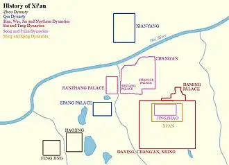 Depuis sa capitale de Xianyang, située au nord de l'actuel site de la ville, la dynastie Qin a régné sur une zone plus vaste que celle contrôlée par les dynasties précédentes. Sous la dynastie Han et pendant la période des Trois Royaumes, la ville impériale de Chang'an était située au nord-ouest de l'actuelle Xi'an. Détruite lors de la chute de la dynastie Jin de l'Ouest, Chang'an est reconstruite sur un autre site. Sous la dynastie Tang, elle est localisée sur un emplacement correspondant à la zone située à l'intérieur des fortifications de la future Xi'an des Ming, plus quelques petites zones à l'est et à l'ouest, et une grande partie des banlieues sud. La Chang'an des Tang était donc huit fois plus grande que la Xi'an des Ming, qui a été reconstruite sur les restes de l'ancien quartier impérial de la ville sous les dynasties Sui et Tang. À son apogée, Chang'an était l'une des villes les plus grandes et les plus peuplées du monde. Vers 750 après J.-C., Chang'an est surnommée « ville d'un million d'habitants » dans les archives chinoises, alors que les estimations modernes la situent entre 800 000 et 1 000 000 d'habitants à l'intérieur des murs de la ville[1]. Cependant, Charles Benn[2], Patricia Ebrey, Anne Walthall et James Palais [3] affirment que Jingzhao Fu (京兆府), soit la zone métropolitaine comprenant Chang'an et les petites villes des environs, abritaient une population d'environ 2 000 000 de personnes. Enfin, selon le recensement de 742 enregistré dans le Nouveau Livre des Tang, 362 921 familles comptant 1 960 188 personnes ont été recensées à Jingzhao Fu[4].