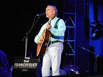 Plus inspiré par la tradition folklorique, Gilles Vigneault développe à compter du tournant des années 1960 un important répertoire qui lui assure une notoriété durable, à commencer par « Jack Monoloy » et « La danse à Saint-Dilon »[94]. Tout en donnant vie à une galerie de personnages pittoresques et légendaires, il saisit à bras-le-corps la thématique patriotique dans des chansons comme « Mon pays » et, plus tard, « Gens du pays », qui devient en quelque sorte l’hymne national non officiel du Québec[95].
