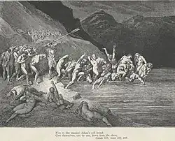 Charon pousse les âmes dans la barque, illustration de Paul Gustave Doré En regardant au-delà, Dante voit des gens entassés sur la rive d'un grand fleuve, prêts à le traverser, et il demande à Virgile qui ils sont : il ne le saura que lorsqu'ils atteindront la triste rive de l'Achéron. Dante a alors honte de son impatience et, le regard honteux et grave, s'abstient de parler jusqu'à ce qu'ils atteignent le rivage.