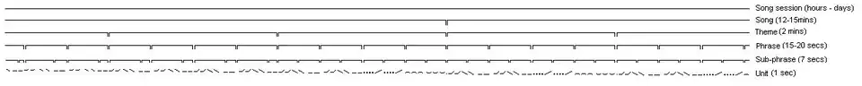 Une suite de 4 à 6 unités forme une sous-phrase, et dure environ 10 secondes. Au moins deux sous-phrases forment une phrase. Une baleine répète généralement une même phrase pendant 2 à 4 minutes, ce que l'on appelle un thème. Une suite de thèmes forme un chant. Les baleines peuvent répéter ce chant - qui dure environ 20 minutes - pendant des heures, voire des jours entiers. Cette hiérarchie linguistique en « poupées russes » a captivé l'attention des chercheurs.