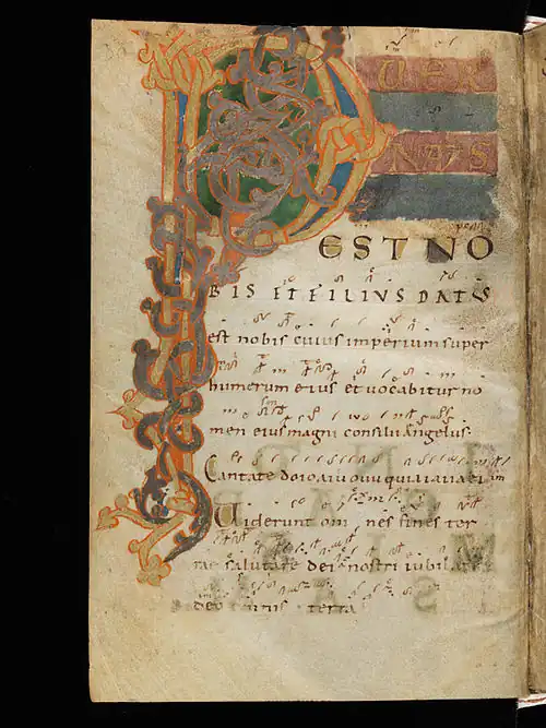 Ce livre de chant complet sans neumes fut copié, vers 800, à l'abbaye du Mont-Blandin près de Gand, qui était étroitement liée à Charlemagne[w 10].