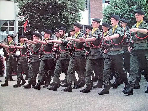 Les écoles d’officiers ont commencé à enregistrer dès la fin des années 1950, mais cet usage va surtout se généraliser à partir des années 1970 avec celui de créer des chants de promotion[22]. Les élèves agissent à la fois comme un filtre en sélectionnant les chants qu’ils préfèrent et une caisse de résonance par leur fonction ultérieure de chef de section où ils peuvent enseigner le répertoire qu’ils ont adopté en école. L’état-major veut contrôler le répertoire en éditant un recueil de chants officiel en 1980, le TTA 107. Mais celui-ci ne correspond pas aux besoins de la troupe au point d’être refondu dans une nouvelle édition en 1985 qui ne s’avère pas plus adaptée. Durant cette même période qui correspond à l’arrivée de la gauche au pouvoir, deux circulaires tentent d’encadrer la pratique du chant dans l’armée[2]. Ces initiatives n’ont pas d’influence palpable sur la pratique, non pas pour refus d’obéissance, mais parce que le chant a toujours relevé des usages et que les usages se plient difficilement à la réglementation. Ces diverses péripéties n’ont pas empêché les créations nouvelles que ce soit dans la troupe (Chant du 8e RPIMa, Ceux du Liban, TOE…) ou dans les écoles (Le Dolo cornu, France fidèle, chants de promo…). Plus de 500 chants nouveaux sont recensés depuis 1980, montrant la vitalité du chant dans l'armée française.