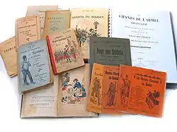 Les cahiers de chanson manuscrits des soldats : Il existe de nombreux cahiers de chanson rédigés, surtout à partir de 1872 et la généralisation de la conscription, mais les chants qu’ils réunissent donnent un aperçu différent de ceux qui étaient en usage. Ceux rédigés dans les tranchées[15] sont plus fidèles au répertoire vécu, mais la plupart de leurs chants n’ont pas survécu à la guerre. Le plus ancien remonte au milieu du XVIIIe siècle et a été retrouvé en Savoie[16].