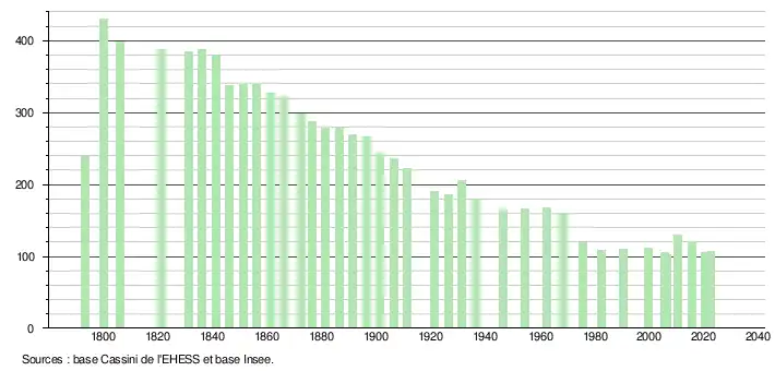 L'évolution du nombre d'habitants est connue à travers les recensements de la population effectués dans la commune depuis 1793. Pour les communes de moins de 10 000 habitants, une enquête de recensement portant sur toute la population est réalisée tous les cinq ans, les populations de référence des années intermédiaires étant quant à elles estimées par interpolation ou extrapolation[16]. Pour la commune, le premier recensement exhaustif entrant dans le cadre du nouveau dispositif a été réalisé en 2005[17].