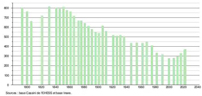 L'évolution du nombre d'habitants est connue à travers les recensements de la population effectués dans la commune depuis 1793. Pour les communes de moins de 10 000 habitants, une enquête de recensement portant sur toute la population est réalisée tous les cinq ans, les populations de référence des années intermédiaires étant quant à elles estimées par interpolation ou extrapolation[32]. Pour la commune, le premier recensement exhaustif entrant dans le cadre du nouveau dispositif a été réalisé en 2006[33].