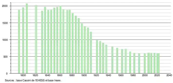 L'évolution du nombre d'habitants est connue à travers les recensements de la population effectués dans la commune depuis 1793. Pour les communes de moins de 10 000 habitants, une enquête de recensement portant sur toute la population est réalisée tous les cinq ans, les populations de référence des années intermédiaires étant quant à elles estimées par interpolation ou extrapolation[15]. Pour la commune, le premier recensement exhaustif entrant dans le cadre du nouveau dispositif a été réalisé en 2005[16].