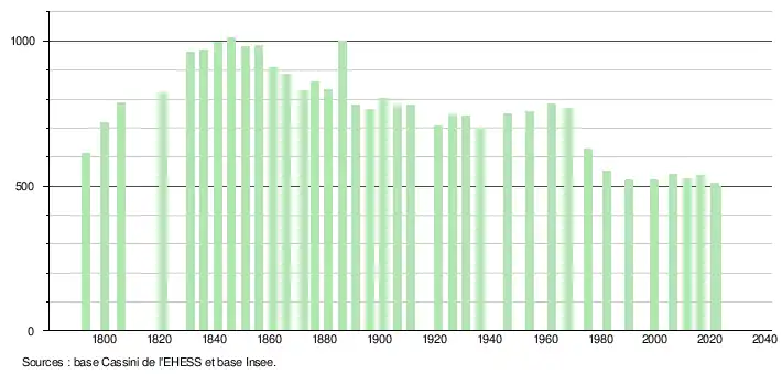 L'évolution du nombre d'habitants est connue à travers les recensements de la population effectués dans la commune depuis 1793. Pour les communes de moins de 10 000 habitants, une enquête de recensement portant sur toute la population est réalisée tous les cinq ans, les populations de référence des années intermédiaires étant quant à elles estimées par interpolation ou extrapolation[25]. Pour la commune, le premier recensement exhaustif entrant dans le cadre du nouveau dispositif a été réalisé en 2006[26].