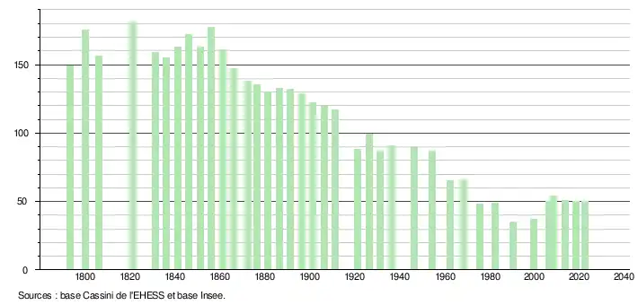 L'évolution du nombre d'habitants est connue à travers les recensements de la population effectués dans la commune depuis 1793. Pour les communes de moins de 10 000 habitants, une enquête de recensement portant sur toute la population est réalisée tous les cinq ans, les populations de référence des années intermédiaires étant quant à elles estimées par interpolation ou extrapolation[22]. Pour la commune, le premier recensement exhaustif entrant dans le cadre du nouveau dispositif a été réalisé en 2008[23].