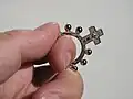 Au sommet, se trouve une croix (souvent à 4 branches égales) symbolisant la prière du Notre Père. Sur le pourtour, 10 petites sphères également réparties symbolisant chacune celle du Je vous salue Marie.