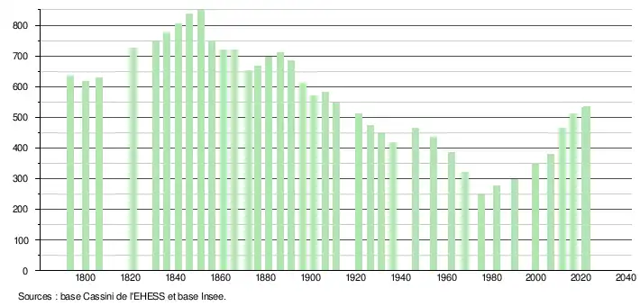 L'évolution du nombre d'habitants est connue à travers les recensements de la population effectués dans la commune depuis 1793. Pour les communes de moins de 10 000 habitants, une enquête de recensement portant sur toute la population est réalisée tous les cinq ans, les populations de référence des années intermédiaires étant quant à elles estimées par interpolation ou extrapolation[18]. Pour la commune, le premier recensement exhaustif entrant dans le cadre du nouveau dispositif a été réalisé en 2006[19].