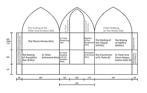 Le thème du décor est celui de l'historia salutis, c'est-à-dire l'histoire du salut de l'homme, du péché originel à l'intervention de Pierre, héritier direct du Christ et fondateur de l'Église romaine. Les sources du complexe sont la Genèse, les Évangiles, les Actes des Apôtres et la Légende dorée de Jacques de Voragine. Pierre est toujours reconnaissable dans les fresques par sa robe vert foncé, un manteau orange, ses cheveux blancs courts et une barbe.