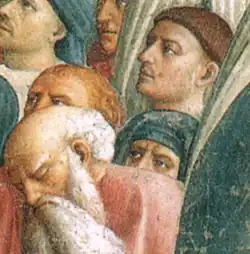 Dans le groupe des apôtres, la figure de droite, vêtue de bordeaux, qui apparaît avec les traits bien définis, une tignasse et une barbe, est emblématique. Selon certains, il pourrait s'agir de l'autoportrait de Masaccio (que d'autres identifient plutôt dans la scène en dessous), tandis que d'autres l'indiquent comme un portrait possible du client Felice Brancacci.
