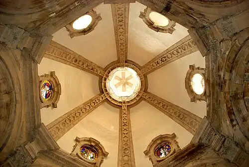 La chapelle est surmontée d'une coupole compartimentée par des nervures de pierre et couronnée par le lanternon. Chacun des six voûtains de la coupole est percé d'un oculus ovale à clef et larmier saillants, dont trois seulement sont ornés de vitraux.