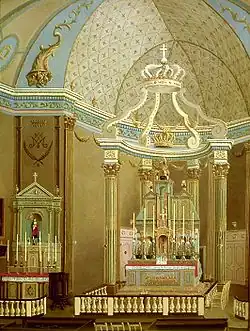 Le sanctuaire et les murs sont faits de marbre blanc avec des incrustations d'or. Le plafond, orné par les huit scènes peintes par François-Édouard Meloche entre 1886 et 1891, illustre la vie de la Vierge[5]. En 1908, la voûte a été redécorée par l'artiste Delphis-Adolphe Beaulieu par un procédé de marouflage, une technique qui permet de conserver de manière presque intacte le décor d'origine[6]. Les fresques de Meloche ont d'ailleurs été remises en valeur en 1998.