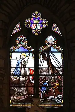 Dans le vitrail face à l'entrée, sont présentés les armoiries d'Olivier de Langlais et de son épouse Edwige de Francheville (qui firent reconstruire la chapelle).