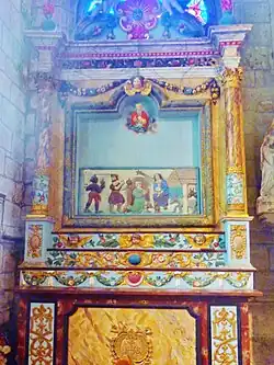 Le retable flamand (originaire d'Anvers ou Malines) de la chapelle Notre-Dame-de-Kerdévot, long de 3,10 mètres et haut de 1,70 mètre, en bois, est composé de 6 scènes sculptées en ronde-bosse dorée, argentée, et polychrome. Il était probablement initialement en forme de "T" renversé, les deux scènes latérales supérieures ayant été rajoutées au XVIIe siècle. Il a été classé Monument historique le pour sa partie ancienne et le pour sa partie plus récente. Onze statues du retable furent volées le , mais certaines ont été retrouvées en 1974[28].