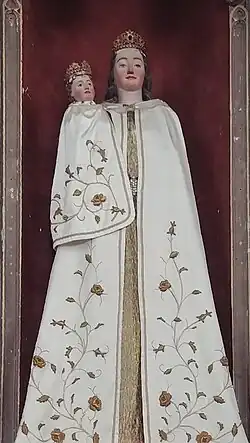 Un villageois aurait trouvé au fond du ravin de la Coudre, dans une source du même nom, une petite Vierge couchée sur le dos, portant un Jésus dans ses bras. Le bruit de cette découverte se répandit dans toute la plaine. On transféra alors la statue d'église en église, mais celle-ci revenait toujours dans la source où elle avait été découverte. La population du hameau situé à côté de la source décida de bâtir une église en l'honneur de la statue. Cependant, plusieurs fois, pendant la nuit, l'église s'effondra. Un jour, l'un des travailleurs lança son marteau en l'air, demandant à la Vierge de le faire retomber à l'endroit où elle souhaitait que l'église soit construite ce qui fut fait. Quelques jours plus tard, l'église était consacrée par le placement de la statue dans une niche du sanctuaire[1],[2].