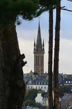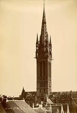 - ↑ «La tour mesure 78 m de haut. La flèche de granit est un octogone percé de 80 ouvertures en rosaces...», in Info Bretagne.