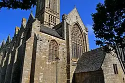 Le transept, l'élévation nord du chœur ainsi que le chevet datent en effet de la seconde moitié du XIVe siècle. Les travaux commencent en 1345[1], aux lendemains de la consécration de la cathédrale du Léon, que Mgr Pierre Benoît a prononcée en 1344[22]. C'est l'année où meurt le prétendant au trône de Bretagne Jean de Montfort et où, sa veuve Jeanne de Flandre et son héritier Jean retenus au château de Tickhill, le Duché est administré en direct par les impopulaires rogues du roi d'Angleterre Édouard III.