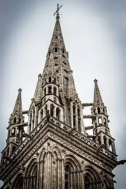 Le clocher, qui s’élève à soixante dix huit mètres au-dessus du sol[29], est typiquement normand. Il s'inspire de la flèche de l'église Saint-Pierre de Caen[30] et de la chapelle de Notre-Dame-du-Mur à Morlaix, construite entre 1372 et 1426 et détruite en 1806.