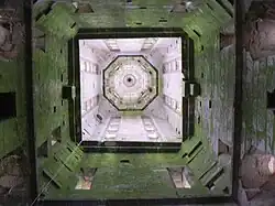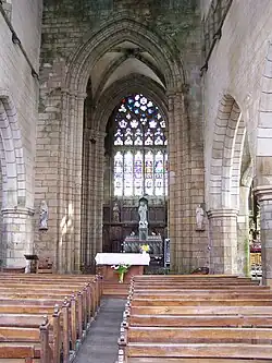 Les travaux s'achèvent sous l'épiscopat de Guillaume Le Ferron, soit entre 1439 et 1472. Les armes du prédécesseur de celui-ci, Jean Prigent, influent évêque de Léon de 1436 et 1439 et par ailleurs constructeur du transept de la cathédrale voisine, de la chapelle du Saint Sacrement dans celle de Saint-Brieuc ainsi que de l'aile septentrionale de Notre Dame de la Cour en Lantic[31], sont sculptées dans la clef de voûte du carré du transept et permettent ainsi de préciser la date du début de la construction de la tour de croisée.