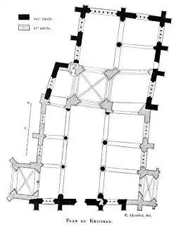 C'est dans ce contexte de paix retrouvée et d'une république épiscopale nouvelle, affirmée en 1296 par une astuce juridique qui libère le Léon de la tutelle de Tours et le rattache directement à la Curie, que, sur l'emplacement de la chapelle antique, commence la construction du Kreisker, au XIIIe siècle comme l'atteste la facture des quatre piliers qui en soutiennent la tour[20], et non, comme le rapporte Albert Le Grand[21], sous le règne de Jean IV, lequel en financera cependant l'essentiel.