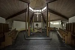 Les sculptures thématiques en pierre ont été réalisées par Helmut Lutz, tandis que les vitraux ont été conçus par Alfred Riedel (de). Le crucifix au-dessus de l'autel ainsi que la statue de la Vierge Marie ont été sculptés dans du bois. Un carré Sator est enchâssé dans le plancher[1].