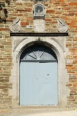 La façade est percée d'un portail en pierre bleue aux piédroits harpés dont la moulure affecte la forme de fines colonnettes que prolongent les voussures de l'arc en plein cintre.