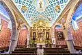 L'autel est orné de quatre colonnes torsadées en bois doré de style baroque, décoré de feuilles d'acanthe. Derrière lui se trouve un cul de four avec un clocher. Les fresques qui ornent le cul de four représentent la table des apôtres de Jésus et datent du XVIe siècle.