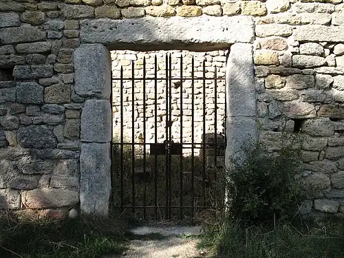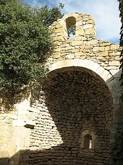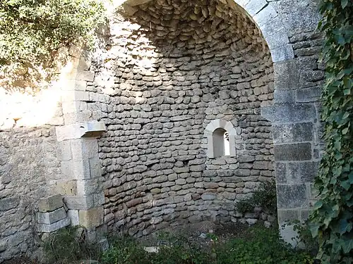 L'intérieur, à ciel ouvert, conserve un bel arc triomphal en pierre de taille[1] aux impostes saillantes et une belle abside voûtée en cul-de-four.