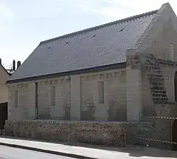 L'édifice roman, de construction soignée, réduit à sa nef puisqu'il ne comporte ni chevet, ni clocher, fait 17,50 m de long (probablement 24 m à l'origine avec le chevet), 8,60 m de large et 10,15 m de haut avant restauration (au moins 2 m de plus avec le sol à son niveau d'origine retrouvé). Cela dégage une salle intérieure de 17 m de long sur 6,50 m environ. Les murs en pierre de taille de tuffeau ont une épaisseur moyenne de 1 m. Le bâtiment est pourvu de contreforts bien que l'église n'est pas voûtée en pierre. La chapelle dispose ainsi d'une belle charpente, refaite au XVe siècle, à chevrons formant vingt-sept fermes en chêne, comme une « coque de vaisseau » renversée[7]. La toiture à long pan est en ardoise. Deux portails en arc brisé, l'un au sud (encore fermé), l'autre à l'ouest, constituent les accès à la chapelle. Les renforts sur ce dernier permettent d'imaginer un porche et un pignon accentué faisant office de clocher, à moins que ce dernier ait été arasé. Les deux façades latérales à gouttereaux sont bordées d'un bandeau sous toiture, avec moulures et modillons sculptés représentant, côté nord, des têtes d'hommes, de femmes, des figures monstrueuses, des ornements géométriques et végétaux. Elles sont percées de trois fenêtres, qui ont été restituées au nord lors de la restauration et qui sont à arc en plein cintre, appareillé de 7 claveaux, sur la façade sud, plus riche — creusée en interne d'un lavabo ecclésiastique d'époque romane — qui donne par ailleurs actuellement sur un jardin privé. Celle du nord repose sur une portion des vestiges de l'enceinte gallo-romaine de la ville. On ne sait rien du décor proposé par le chevet qui concentrait peut-être l’essentiel de l’intérêt artistique de l’édifice, ni de l'aménagement intérieur, si ce n'est l'emplacement de l'autel[8]. Désormais un module administratif contemporain tient lieu de chevet, agrandissant l'espace disponible.