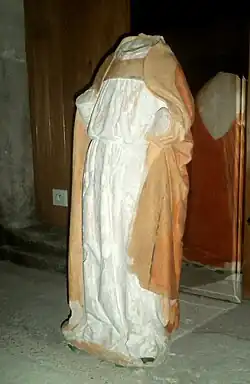 Les indices archéologiques en témoignent : l'autel ainsi retrouvé, qui semble avoir toujours été situé à cet endroit dans le temps, auquel s'ajoutent les bases de deux colonnes bien antérieures au XIIe siècle, ainsi qu'une trace attestant du début du chevet dont la chapelle est amputée, sans oublier une très surprenante statue d'évêque de 90 cm de haut, visiblement enterrée là rituellement au XVe siècle, couchée sur le dos[35],[36], amputée de sa tête et des mains [37]; mais finalement, peu de traces sur l'usage religieux du site, si ce n'est sa fonction funéraire la plus récente : quarante sépultures ont ainsi été dénombrées, probablement une même famille de notables, adultes et enfants, enterrés soigneusement dans des linceuls[38], qui pourraient dater du XVIe siècle, sans que l'on sache encore de quelle famille il s'agit, du fait du manque d'indices[note 7], malgré quelques suggestions[note 8]. Petit aléa anecdotique : la photo grand format qui avait été faite de l'un des squelettes a rapidement été volée[17].