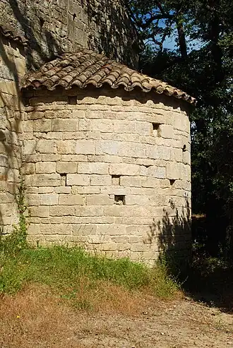 À l'est, l'église présente un chevet composé d'une abside semi-circulaire unique beaucoup plus basse que la nef. Cette abside, couverte de tuiles, est édifiée en pierre de taille disposée en appareil alterné (assises de pierres de taille minces et hautes, posées alternativement à plat et sur champ). Flanquée de contreforts en pierre de taille, elle est percée d'une fenêtre axiale à arc monolithe, alignée avec une fenêtre similaire percée dans le pignon oriental.