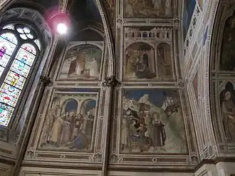 Les vitraux des trois ouvertures, avec des figures similaires à celles des montants, ont été réalisés par Giovanni di Bonino sur un dessin probable de Simone Martini, en 1312-1317.