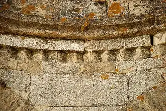 L'abside elle-même est également couverte d'une voûte en cul-de-four, partiellement effondrée. Cette voûte prend appui sur une corniche moulurée soulignée d'une frise de dents d'engrenage.