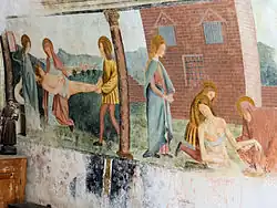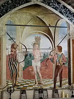 On peut voir sur le chevet plat, saint Sébastien dévêtu, attaché à une colonne, percé de flèches, entouré de deux archers vêtus élégamment. La scène du supplice est placée sous un porche voûté. La représentation du saint rappelle celle que Pérugin a adopté dans ses tableaux : le corps est porté par une jambe, l'autre est légèrement plié et est en retrait.