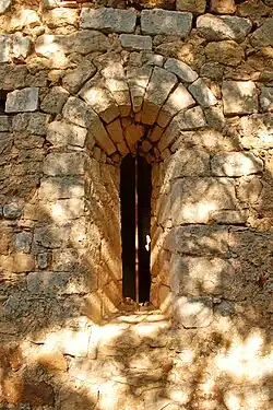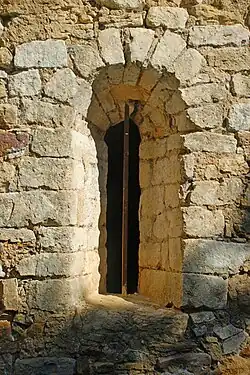 La façade méridionale est percée d'un porte surmontée d'un arc en plein cintre réalisé en pierre calcaire grise, ainsi que d'une petite fenêtre aux piédroits harpés et au linteau monolithe.