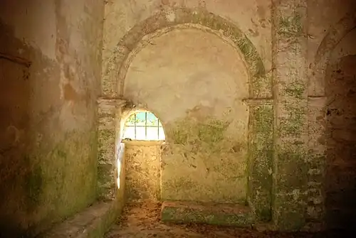 À l'intérieur, les murs de la nef sont rythmés par de grands arcs de décharge retombant sur des piliers à impostes saillantes.