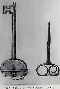 - Un étui en argent de la clef en fer dite de saint Tugen. Argent doré monté sur un pied de calice polylobé, chantourné à accolades, tige à nœuds et à boutons. Il porte le poinçon RB pour René Blanchet, maître orfèvre à Quimper dans les années 1640[28],[19]. Le coffret est une boîte en forme de clé pour recevoir la clef en fer, elle-même enfermée dans un étui en argent en forme de clef. Cette clef, sans panneton, à la forme d’un poinçon de fer, long de quatorze centimètres, finissant par une poignée en forme de double volute rentrante. Elle ressemble à un tau abbatial, ce qui pourrait correspondre, vu son ancienneté, à la tradition qui fait de saint Tugen le deuxième abbé de Daoulas[29].