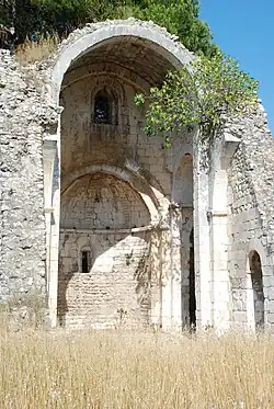 L'arc triomphal, double et légèrement brisé, est surmonté d'une fenêtre. Au piédroit de cet arc triomphal se trouve un remarquable bas-relief figurant deux palmettes opposées.
