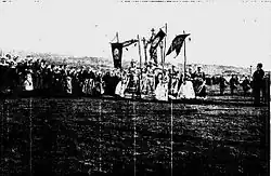 La statue de Sainte-Anne portée de la chapelle à la tribune extérieure pour la cérémonie du couronnement de 1913.